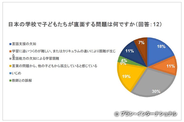 約半数の53%の子どもたちが地元にある日本の学校で学んでいるものの、日本語で勉強することは非常に難しく、カリキュラム通りに学習することは困難と考える割合は67%に上ります。また、約42%が学校の言語サポート不足を指摘しており、多くの子どもたちが孤立を感じています。そのような状況にもかかわらず、母親の中で、日本の学校で子どもがいじめにあったということを確認した人はいませんでした。