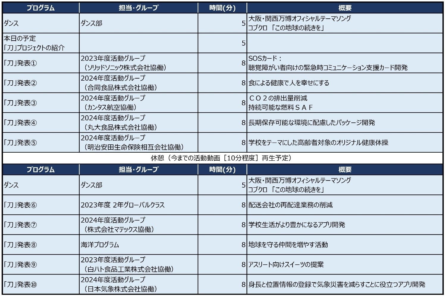 本プロジェクトの成果発表は、2025年6月8日(日)13:30~15:30、大阪・関西万博夢洲会場「大阪ヘルスケアパビリオン」内ステージで行われます。企業との協働を通じた10グループの発表に加え、2年生の グローバルクラス、海外活動報告、ダンス部による演出など、多彩な構成で展開。3月の校内成果発表会を踏まえ、内容をさらにブラッシュアップした上での臨場感あふれる発表となります。