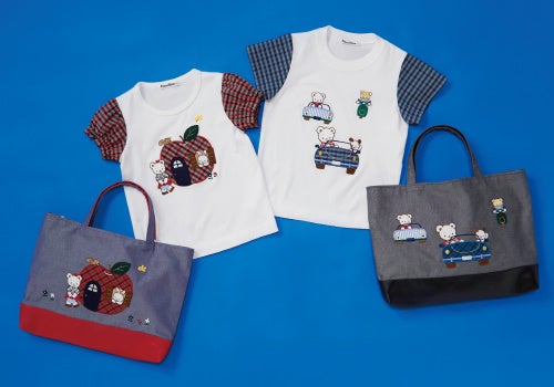 袖とアップリケ刺繍部分に使用したシャンブレー調のファミリアチェックがポイントのおはなしTシャツ。同じデザインがマチ付きバッグになって登場!