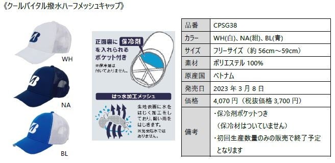 「ウォータークールダウンキャップ」シリーズは、水に濡らして振ることによる水分の蒸発冷却により生地温度を下げる、冷感メカニズム「クールバイタル」※1を採用し、水に濡らして振れば繰り返し冷感効果が得られます。さらに、光触媒生地を 採用したアイテム(CPSG33)や、遮熱素材を採用したアイテム(CPSG36)、キャップの正面裏側に保冷剤ポケットのついたアイテム(CPSG38)など、メンズでスタイル別に5アイテムをご用意しています。