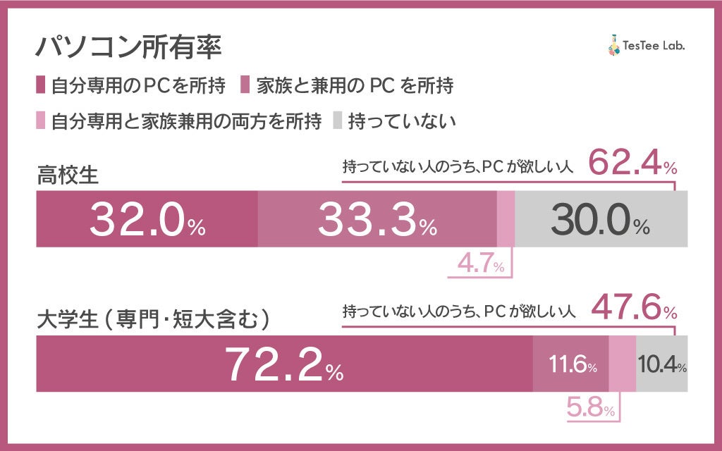 - パソコン所持率は高校生で3割以上、大学生で8割近いことが判明。使用用途は「勉強」が最も多い結果に