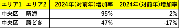一方で、中央区の湾岸エリアでは港区とは対照的な動きが見られました。