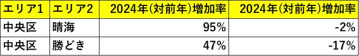 しかし2025年になると状況は一転し、再販マンション増加率は前年比マイナス2%となりました。特に「晴海」「勝どき」といった湾岸エリアでは、再販投資が急速に減速する動きが見られています。