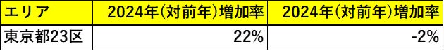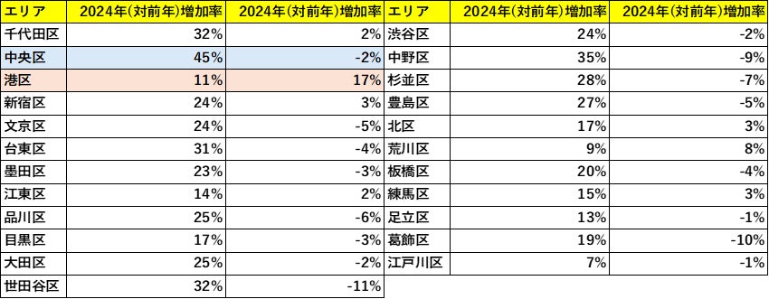 次に、再販マンションの増加率をエリア別に見ていくと、東京23区の中でも異なる動きが見えてきます。