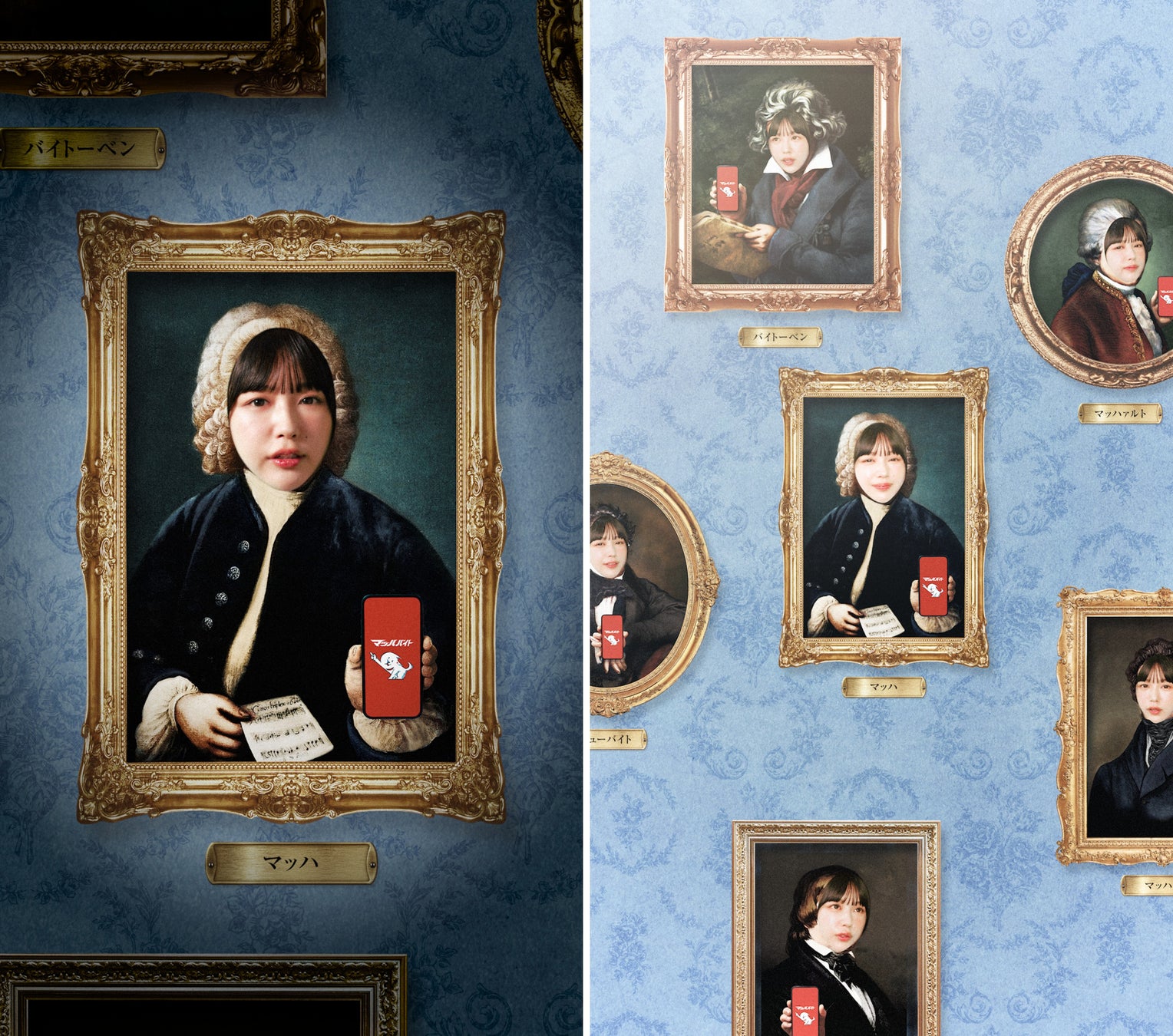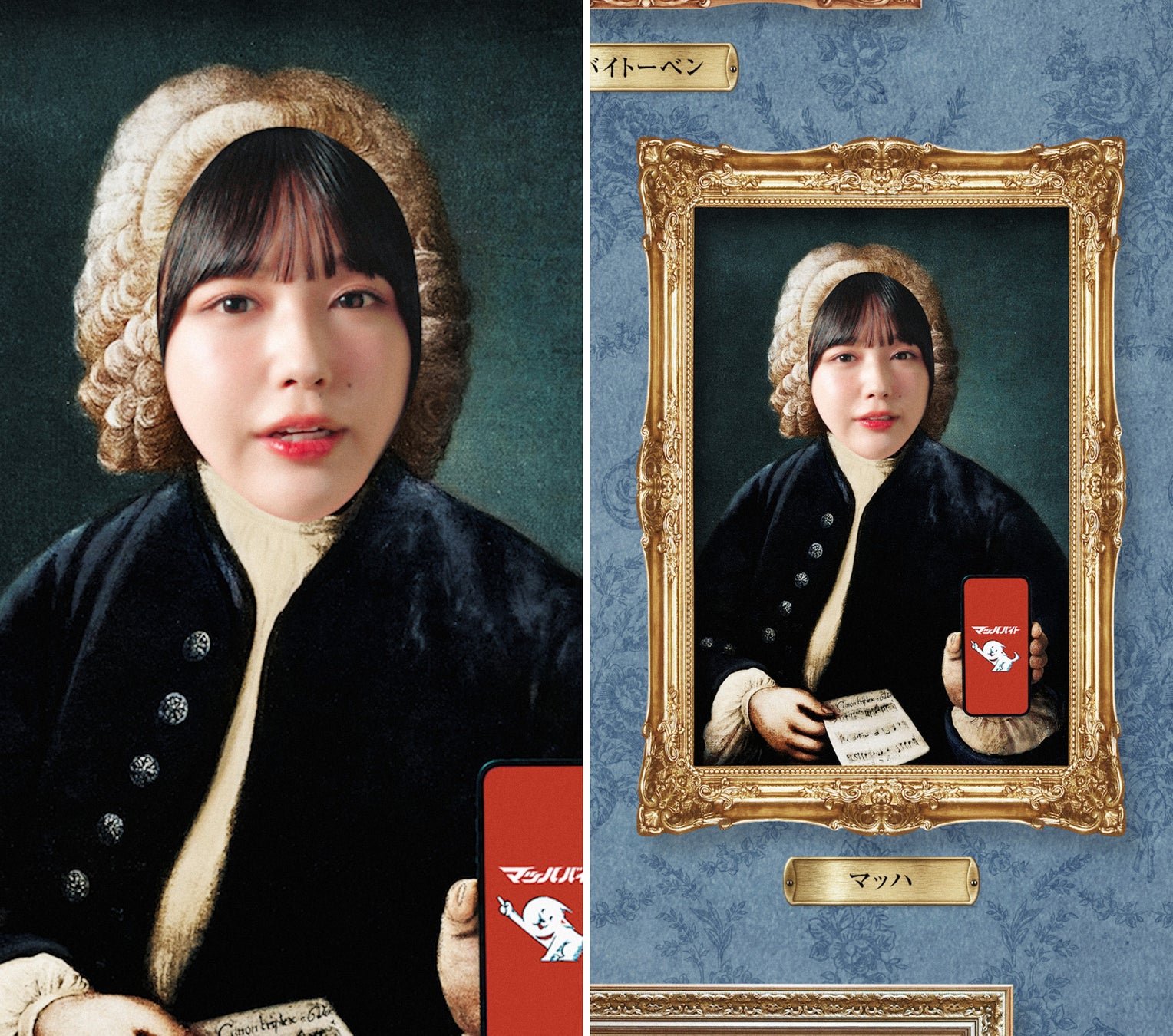 肖像画に扮したなえなのさんが「ばはよう(おはよう)」と挨拶。「バッハじゃなくてマッハです」と自己紹介してマッハバイトの魅力をクラシック音楽にのせてテンポよく叫びます。