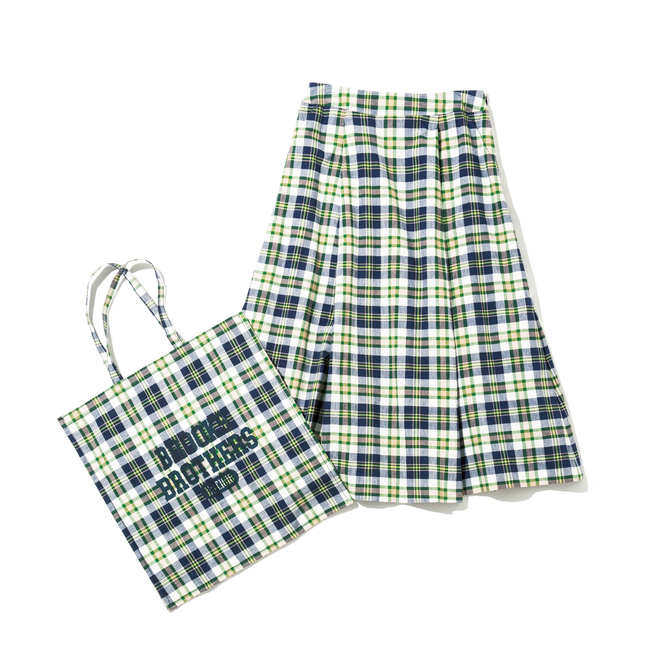 腰回りをすっきり見せてくれる計算されたシルエットと膝下レングスが大人の上品さを演出してくれるマドラスチェック地のタックフレアスカートと、同生地のマドラスチェック柄にBrooks Brothersのロゴを染み込みプリントで施し、ヴィンテージ風に仕上げたトートバッグ。バッグは縦にA3サイズが入る大きさなので、サブバッグやエコバッグなどの用途にもお使いいただけます。毎日使える実用的なアイテムは母の日ギフトにぴったりです。