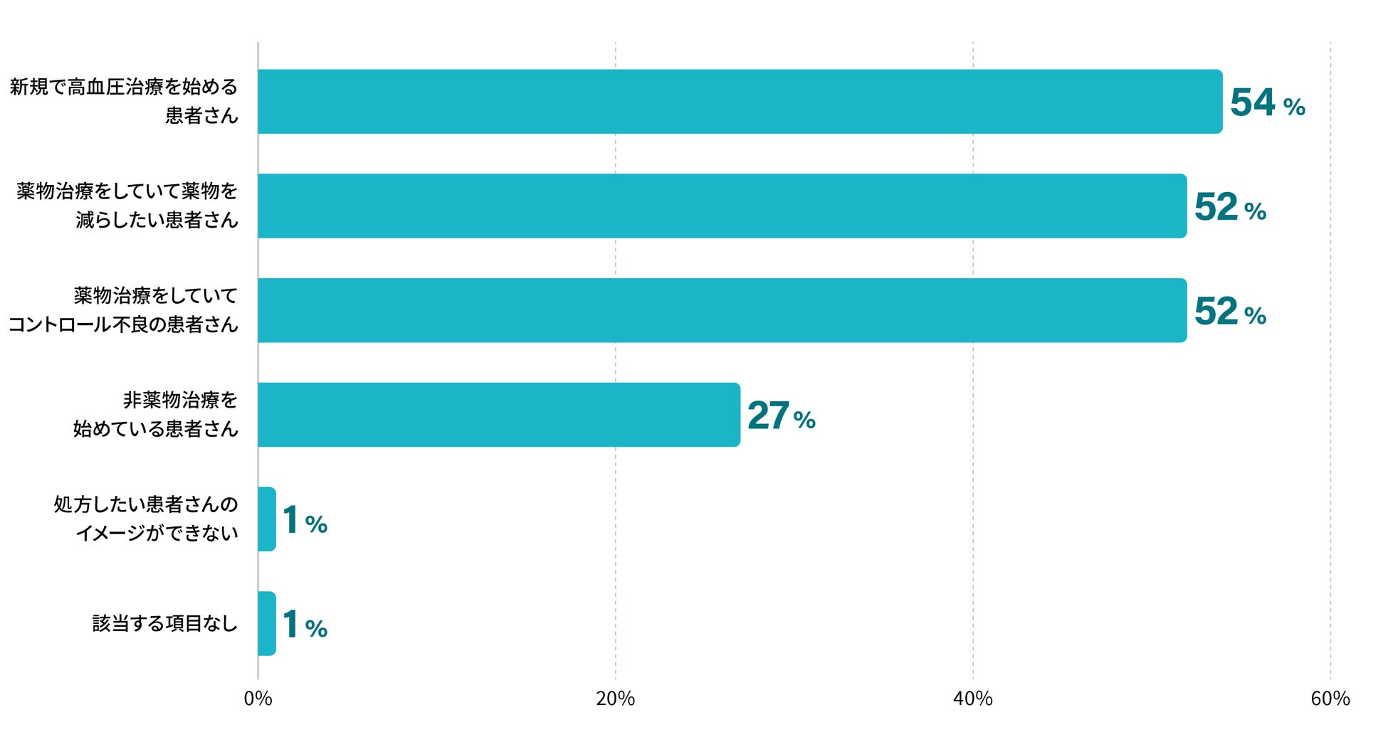 処方したいと思う患者さんの特徴は「新規で高血圧治療を始める患者さん(54.2%)」「薬物治療をしていて薬物を減らしたい患者さん(52.1%)」「薬物治療をしていてコントロール不良の患者さん(52.1%)」であり、患者さんの薬物療法への懸念やニーズとマッチしている。