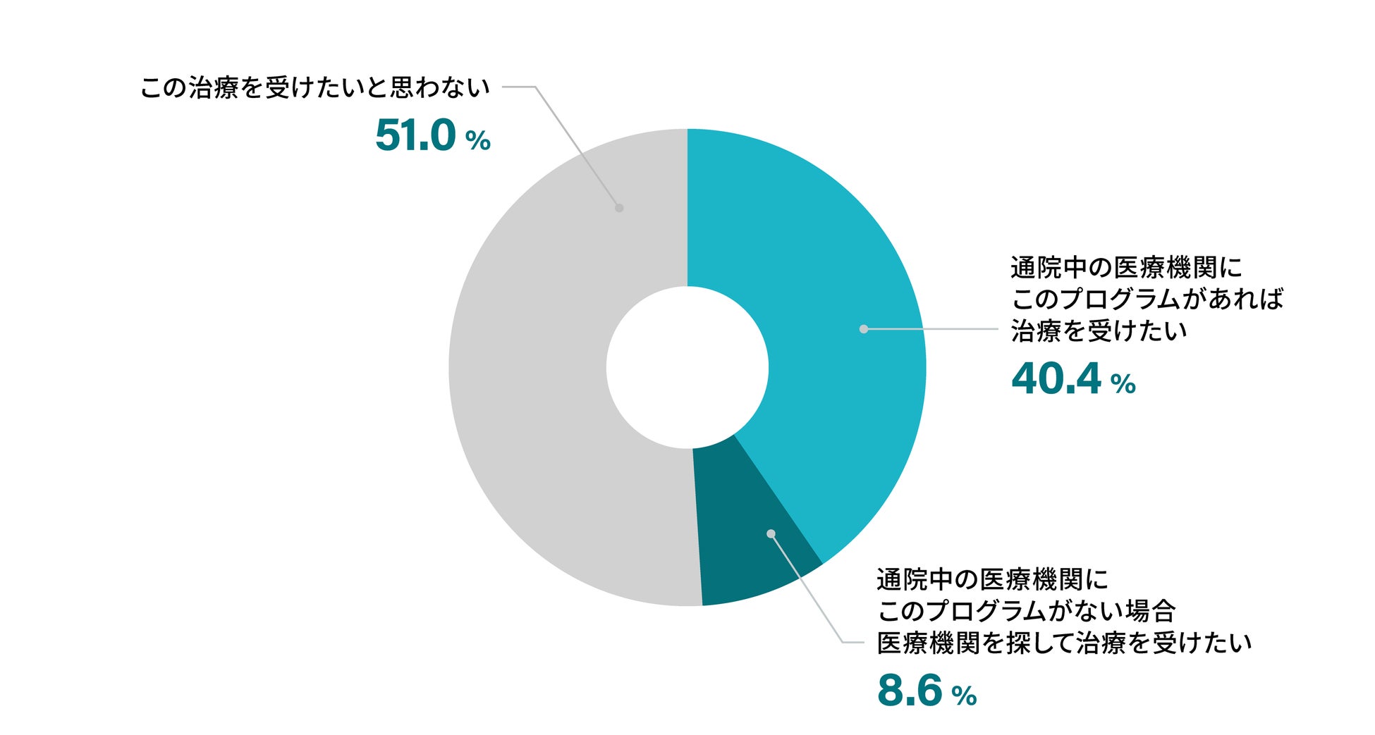 医師に実際に処方しても良いと思い当たる患者さんについて聞くと、14.8%だった。その理由として、「患者負担を受け入れてもらえないのではないかという心配がある」「患者さんが継続できるか分からない」など、患者さんの治療の受け入れに懸念を持っている医師が多い。しかし、高血圧治療者において「CureApp 血圧チャレンジプログラム」を受けたいと思う方は49.0%と、医師と患者さんでギャップがあることが分かった。医師が思っているよりも患者さんが治療を受け入れる可能性が高いことが示唆される。