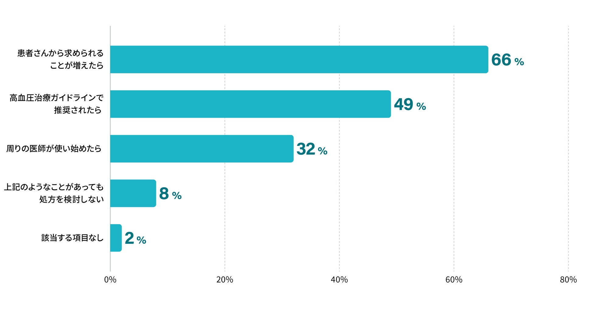 ■処方するためのきっかけとして、医師「患者から求められることが増えたら」65.6%、高血圧患者さん「お医者さんからの勧めがあれば受けたい」51.6%であり、双方の思いはありつつもお互い言い出せていない状態だと推測される