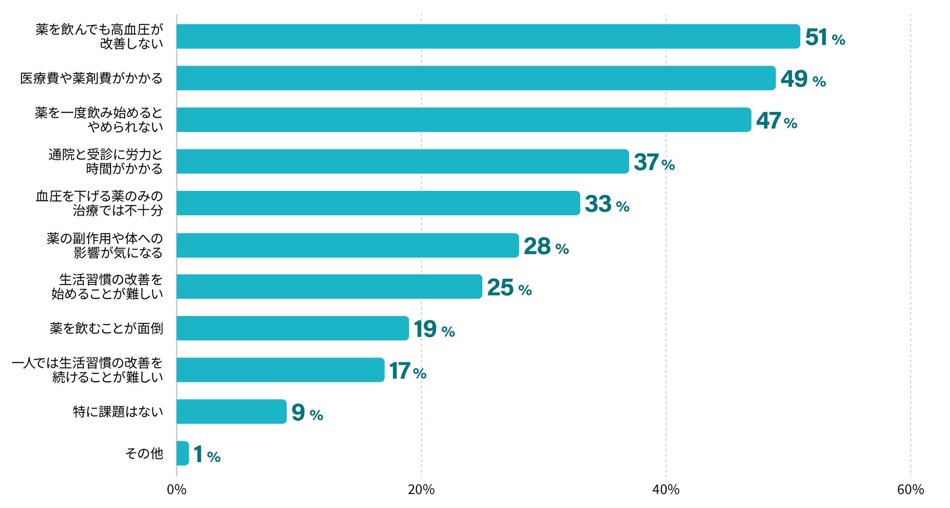 実際に高血圧治療において、薬物療法を実施している割合は89.5%。一方で、高血圧症治療アプリの処方経験がある医師80名で「薬頼みになってしまう」と思っている人は54%であり、患者さんにおいても高血圧治療への不満を聞くと、「薬を飲んでも改善しない(51%)」「医療費や薬剤費がかかる(49%)」「薬を飲むとやめられない(47%)」がトップ3であり、双方とも薬物療法に対して懸念を感じていることがわかる。