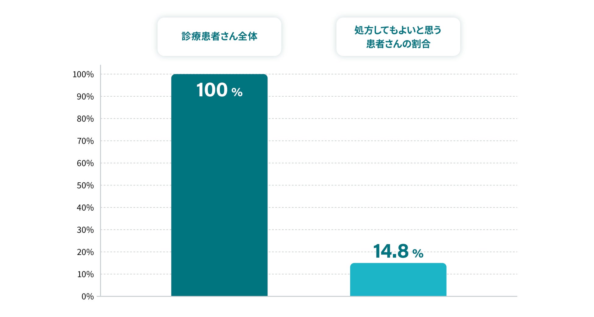 ■治療意向としては、受けたいと思う患者さんは43%。一方で、医師が実際に処方しても良いと思う患者さんは14.8%であり、ギャップが生じている。