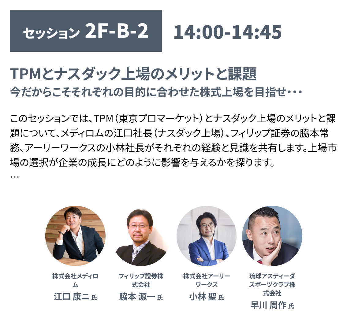 TPM(東京プロマーケット)とナスダック上場のメリットと課題について、当社代表の江口と、フィリップ証券株式会社 脇本源一氏、アーリーワークス 小林聖氏、琉球アスティーダスポーツクラブ株式会社 早川周作氏がそれぞれの経験と見識を共有します。