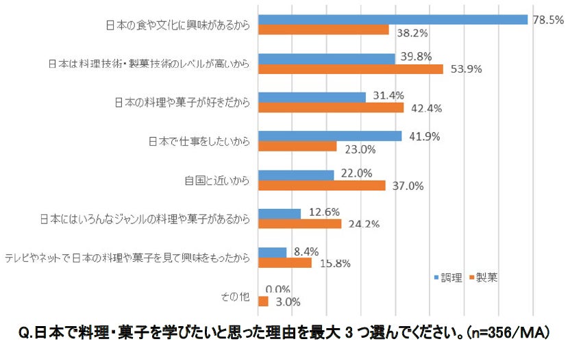 留学先に日本を選んだ理由として、調理を学ぶ学生は「日本の食や文化に興味がある」が78.5%と突出しており、「日本での就職」や「料理技術の高さ」も合わせて選択する組み合わせが多く、文化的関心を出発点としてキャリア志向が動機になっていることがわかります。製菓を学ぶ学生は「製菓技術のレベルが高い」53.9%が最も高く、次いで「日本の菓子が好き」「文化に興味がある」が続き、日本の高い技術力への評価と個人の嗜好性との合致が決め手になっていることがうかがえます。「自国と近い」も37.0%で、現実的な理由も一定数あることがわかります