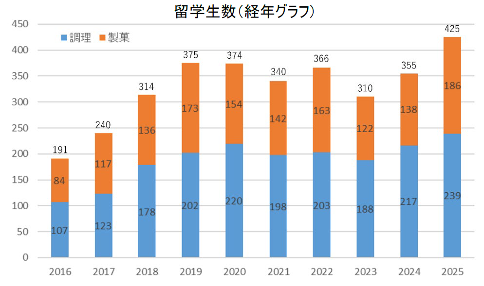 辻󠄀調理師専門学校、辻󠄀調理師専門学校東京(本部:大阪市、代表:辻󠄀芳樹、以下辻󠄀調グループ)では、2025年4月に244名の新入留学生を迎え、在校生と合わせて過去最高の425名の留学生が在籍しています。大阪の「辻󠄀調理師専門学校」では320名、東京の「辻󠄀調理師専門学校東京」では105名の留学生が調理・製菓を学んでいます。また日本料理・西洋料理・中国料理など“調理”を学ぶ学生は辻󠄀調グループ全体で239名、洋菓子・製パン・和菓子など“製菓”を学ぶ学生は186名で、国別では、韓国219名、中国91名、台湾59名と上位3ヶ国は毎年変わらず、全13ヶ国から学びに来ています。コロナ禍を除いて、留学生が増加する要因のひとつに日本での就労機会が増えたことも影響していると考えています。本校では、2026年2月19日時点で日本での就職内定を獲得した留学生は106名で、年々増加しています。