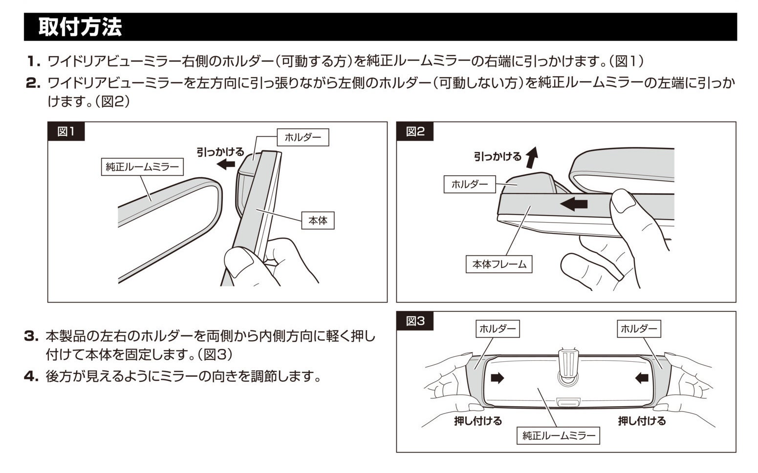 ・取り付けは約10秒、ミラーを左右から挟み込むだけ(スズキ用は別途、カバーを装着)。専用取付構造だからしっかりスマートに装着