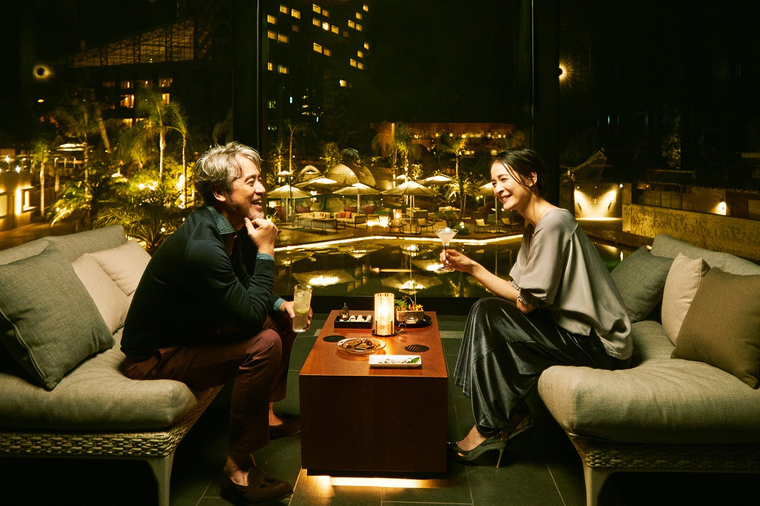 THE LIVING GARDENを一望するガラス張りのシンボリックなバー「KUROBAR」では、プリフィックススタイルのジン・トニックや、季節のフルーツから選べるフレッシュフルーツカクテルをメインに、ウイスキーやブランデーなどの洋酒を、こだわりのおつまみとともにご堪能いただけます。また、テイクアウトメニューもご用意。焚火のリビングや水辺のソファでお酒を愉しむリゾートの夜をお過ごしください。
