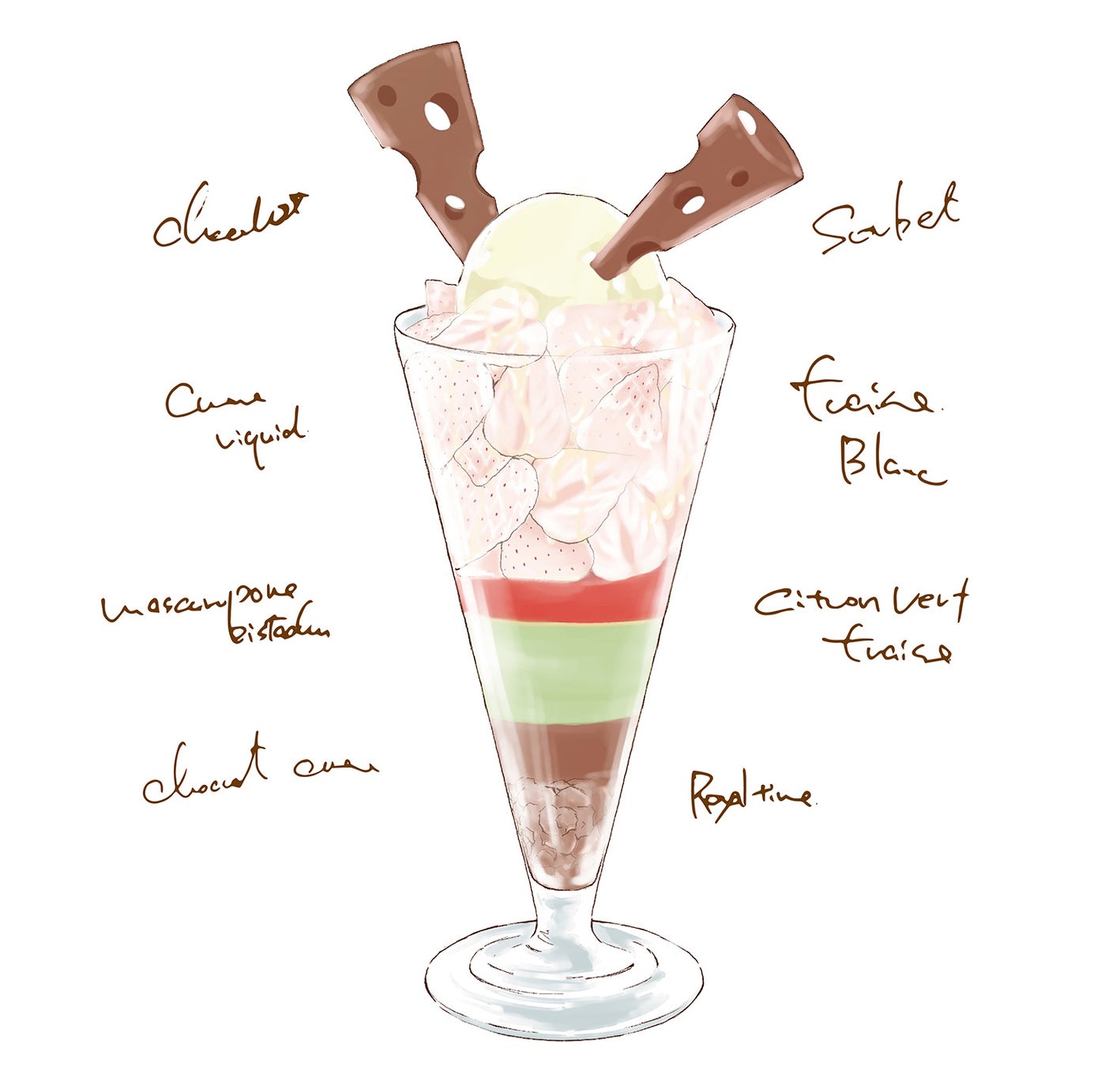 ドン ペリニヨンと宮崎県産のゆずを使用し、すっきりと仕上げたシャーベットや、マスカルポーネクリームのピスターシュ、チョコクリームとともにいちごが織りなすハーモニーをご堪能ください。