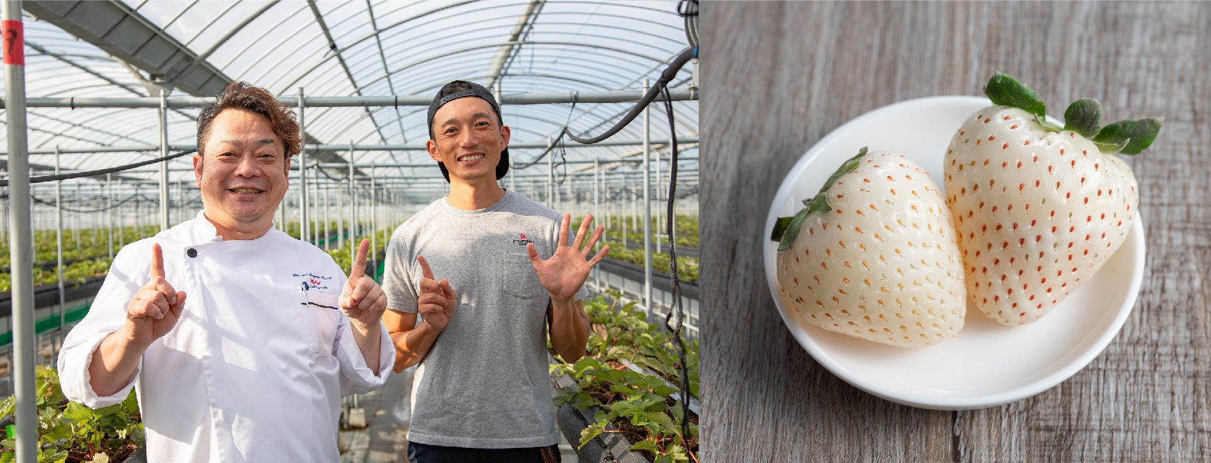 日本初の認定いちごマイスター 長友一平氏の直営農園『ひなたいちご園』の上質ないちごを使い、パティシエが目の前で仕上げていく特別ないちごパフェ。パフェの中に贅沢に敷き詰められた白いちご「ゆきざくら」は、限られたいちご農家でのみ生産される希少な品種。雪や桜を連想する白と淡いピンクの果色に、甘さと酸味のバランスがほどよい味わいのいちごです。