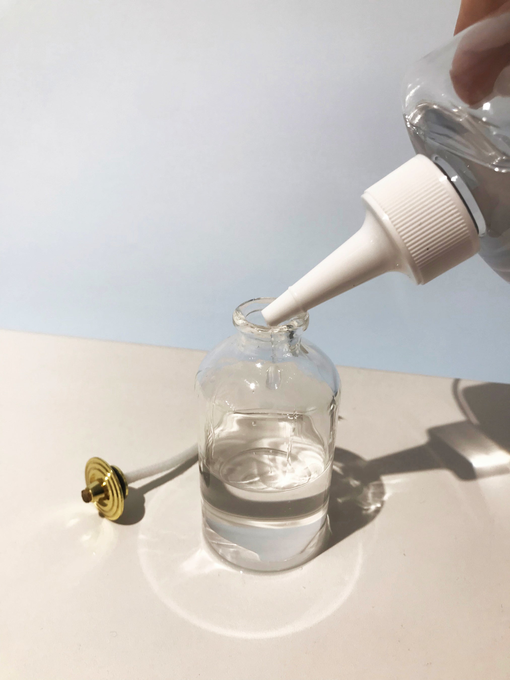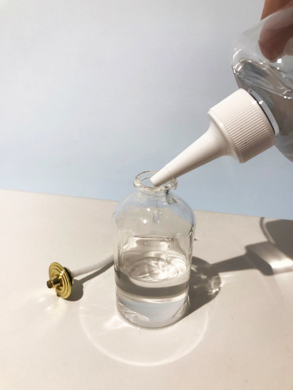 付属のガラスボトルにパラフィンオイル(別売)を入れて繰り返し使えます。