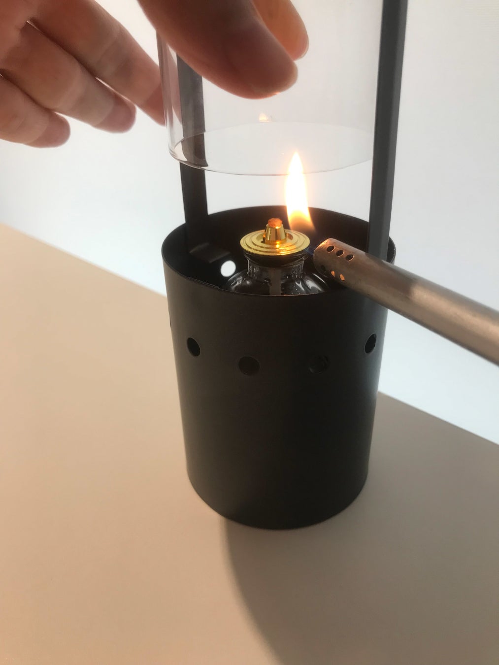 火を消すときは、上部のフタの穴から吹き消すか、タオルなどを使って直接手に触れないようにフタを外してガラスのホヤを持ち上げて吹き消してください。