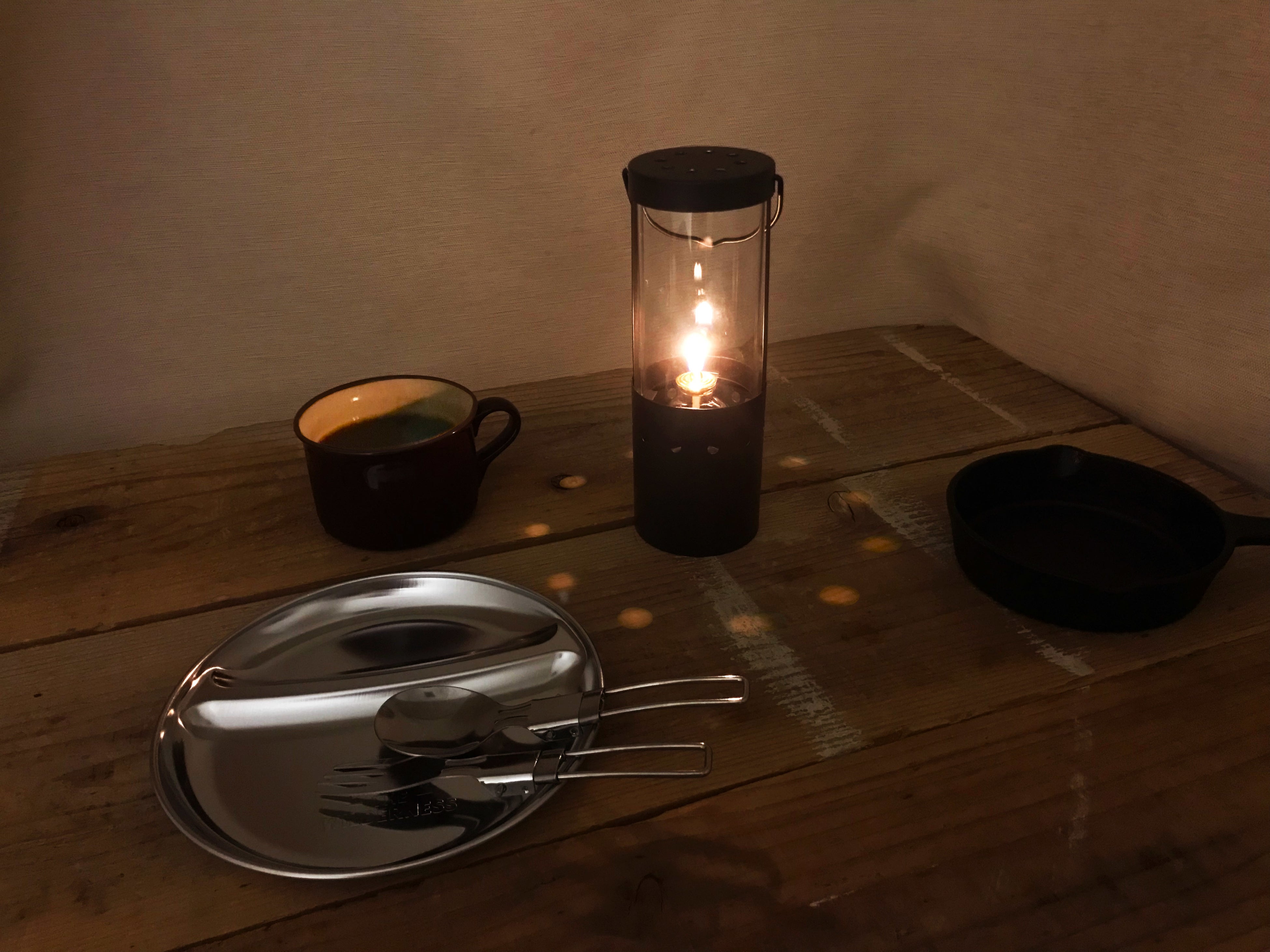「オイルボトルランタン」は卓上でも使いやすいスリムなデザインのランタン。