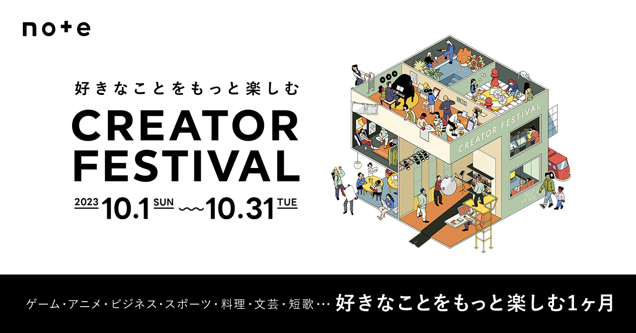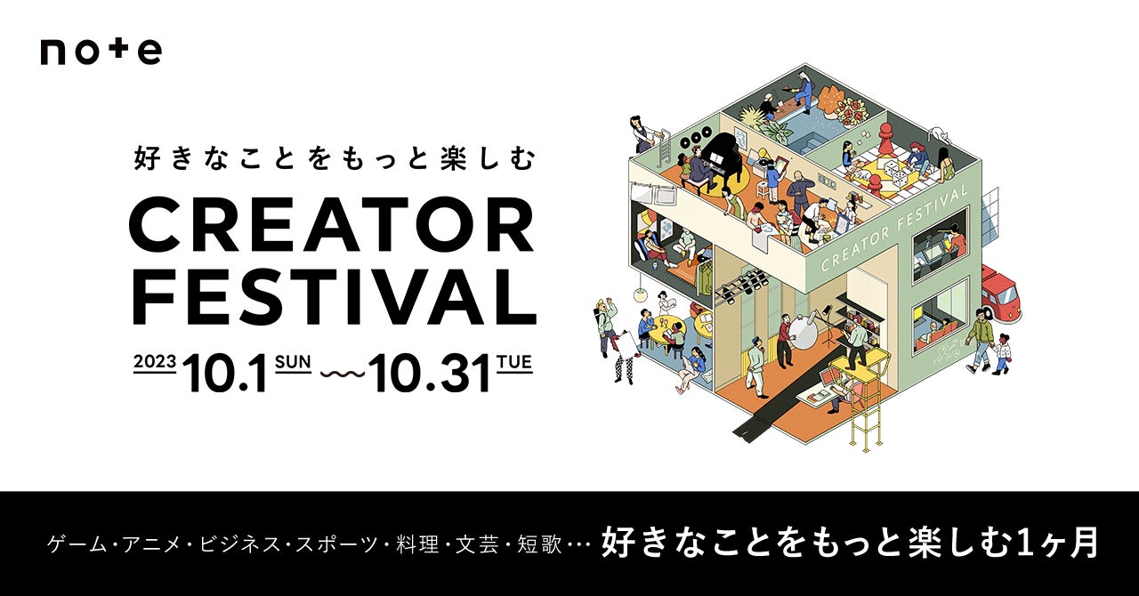 昨年のクリエイターフェス(https://note.jp/n/nebf2930af3c2)は「つくってみた、やってみた」をテーマに参加者も創作にチャレンジしたくなるようなプログラムを開催。関連するハッシュタグがついたnoteへの投稿は53,000件にのぼりました。今年は「好きなことをもっと楽しむ!」がテーマです。トークセッションや参加型イベントでその分野の成り立ちや創作のやり方を知り、実際に創作した成果をnoteで発信して、同じものが好きな仲間とつながる。そんな循環を10月の1ヶ月間で生み出すことを目指します。