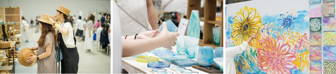 ものづくりに情熱をかたむけるクリエイターの個性あふれるブースが立ち並び、ファッション・インテリア・アート・手工芸品などのオリジナル作品を販売する「マーケット」、伝統工芸士や人気クリエイターによる約60種の作品づくりを体験できる「ワークショップ」、クリエイターが目の前で描き上げる「ライブペインティング」の3つのコンテンツで構成。すべてのクリエイターが公募により決定し、クオリティの高い作品で会場が染まります。日本のクリエイターによる‘ものづくり’の最先端が集結した空間を味わうことができます。