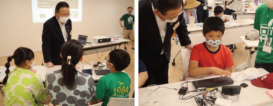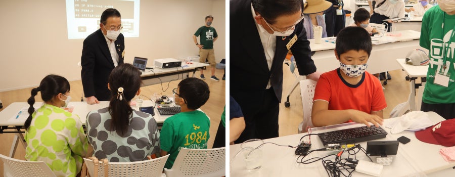 イベントには、東松島市長 渥美巖氏が駆け付け、「楽しんで挑戦することが大切。素晴らしい体験と思い出を持ち帰って、未来のITを担ってくれたらと思います」とエールを送り、いきいきと取り組む子どもたちにさまざまな質問をして会話を楽しんでいらっしゃいました。
