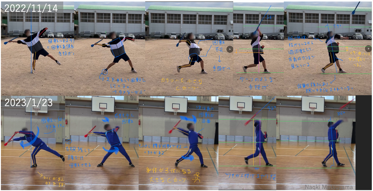 専門的な技術トレーニングを受けた部員(やり投げ選手1名)の技能は飛躍的に改善し(写真4)、実施後は指導前に測定した練習記録(33m34cm)や大会での公式自己記録(37m64cm)を大きく上回る43m50cmを記録するに至っています(動画2)。遠隔部活指導においてはその指導の難しさがかねてから指摘されてきましたが、松山直輝助教はICT機器による指導環境の工夫や知的障害がある部員に様々な支援を行い(動画1)、今回の遠隔部活指導を成功に導きました。他にも、部員には競技を通じて毎時の挨拶や感謝の言葉をしっかり述べる等の情緒やマナーの面での成長が見られた事を報告しています。