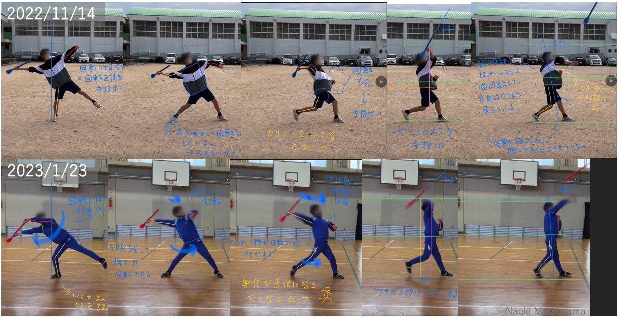 専門的な技術トレーニングを受けた部員(やり投げ選手1名)の技能は飛躍的に改善し(写真4)、実施後は指導前に測定した練習記録(33m34cm)や大会での公式自己記録(37m64cm)を大きく上回る43m50cmを記録するに至っています(動画2)。遠隔部活指導においてはその指導の難しさがかねてから指摘されてきましたが、松山直輝助教はICT機器による指導環境の工夫や知的障害がある部員に様々な支援を行い(動画1)、今回の遠隔部活指導を成功に導きました。他にも、部員には競技を通じて毎時の挨拶や感謝の言葉をしっかり述べる等の情緒やマナーの面での成長が見られた事を報告しています。