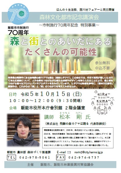 飯能市市制施行70周年記念特別事業 森林文化都市記念講演会『森と街とのあいだにあるたくさんの可能性』を10月15日(日)に開催