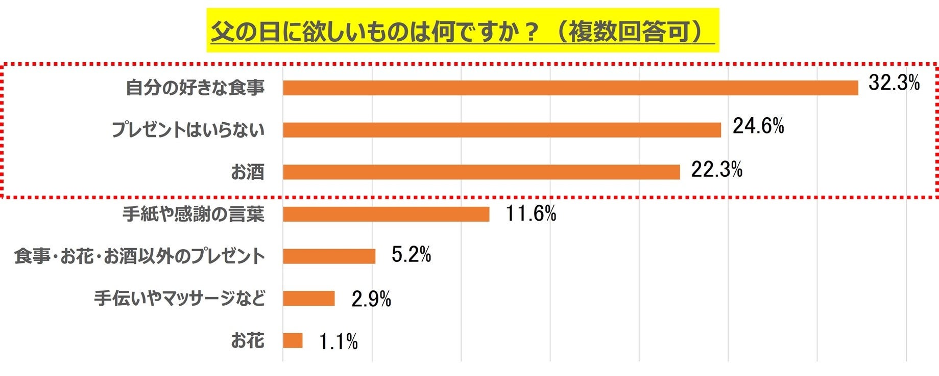 その結果、1位は「お父さんの好きな食事」で58.0%、2位は「お酒」で33.8%、3位は「食事・お花・お酒以外のプレゼント」で29.8%という結果になりました。(複数回答可)