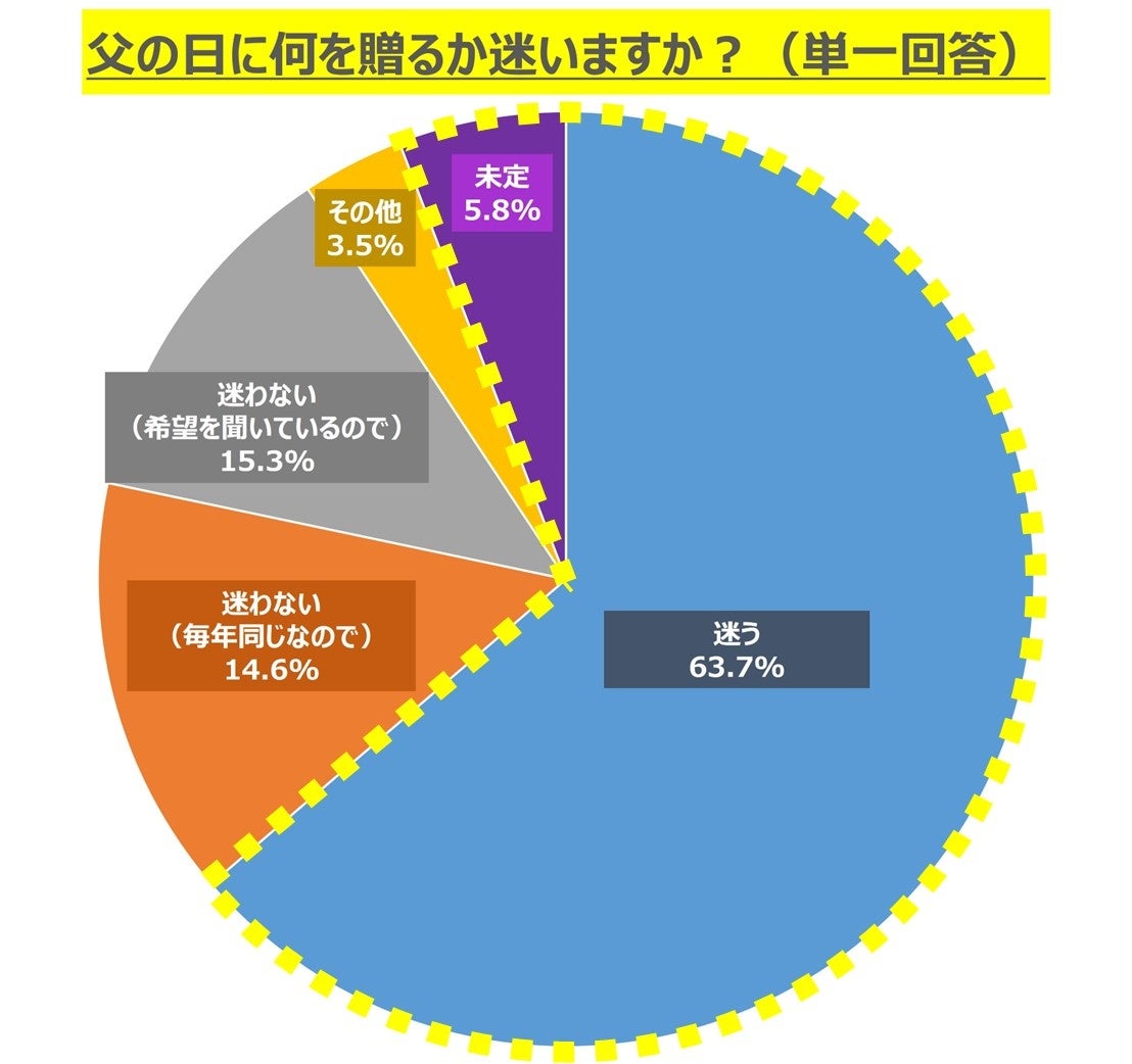 また、プレゼントは「何を贈るか迷う」と回答した方が63.7%、「未定」と回答した方が5.8%となり、約7割の方が父の日の贈り物について迷っていることが分かりました。