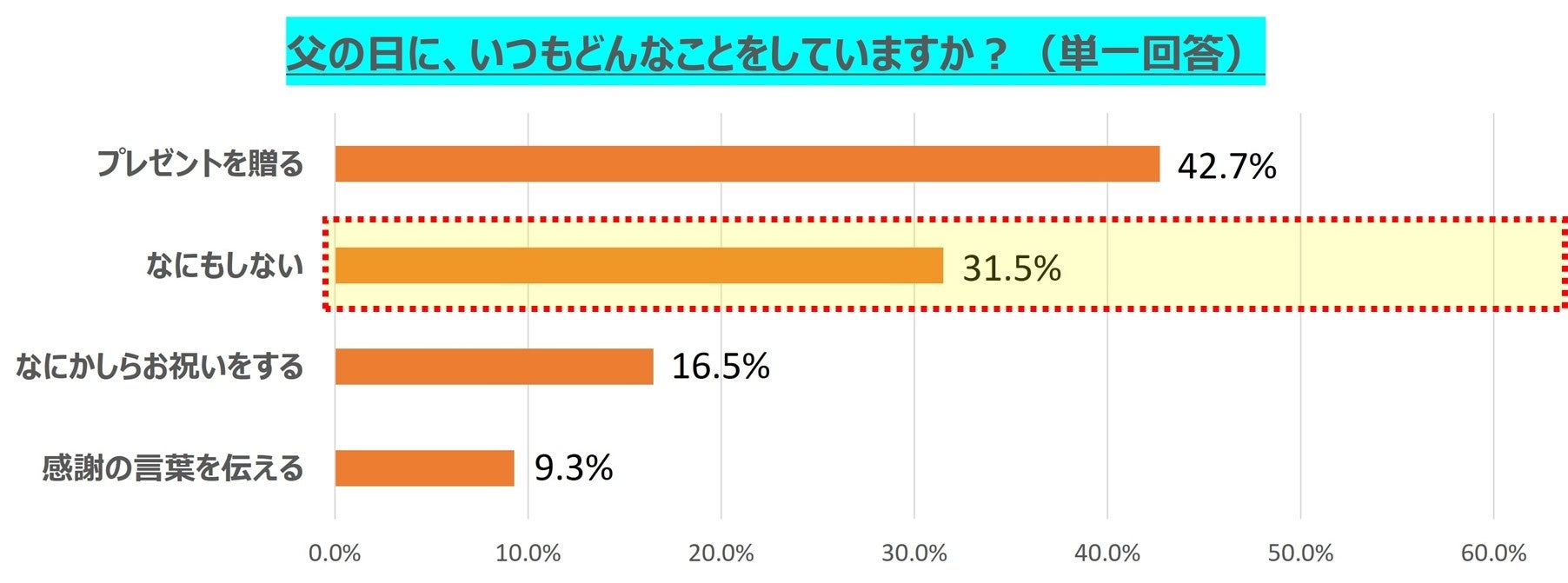 また、「お父さん以外の方」(子どものいない男性、女性)17,515名を対象に、【母の日と父の日に、いつも行っていること】について質問した結果、「なにもしない」の回答が、父の日(31.5%)は母の日(21.7%)に比べて約10ポイント高く、母の日のお母さんほど、父の日に祝ってもらえないお父さんが多いことがうかがえました。