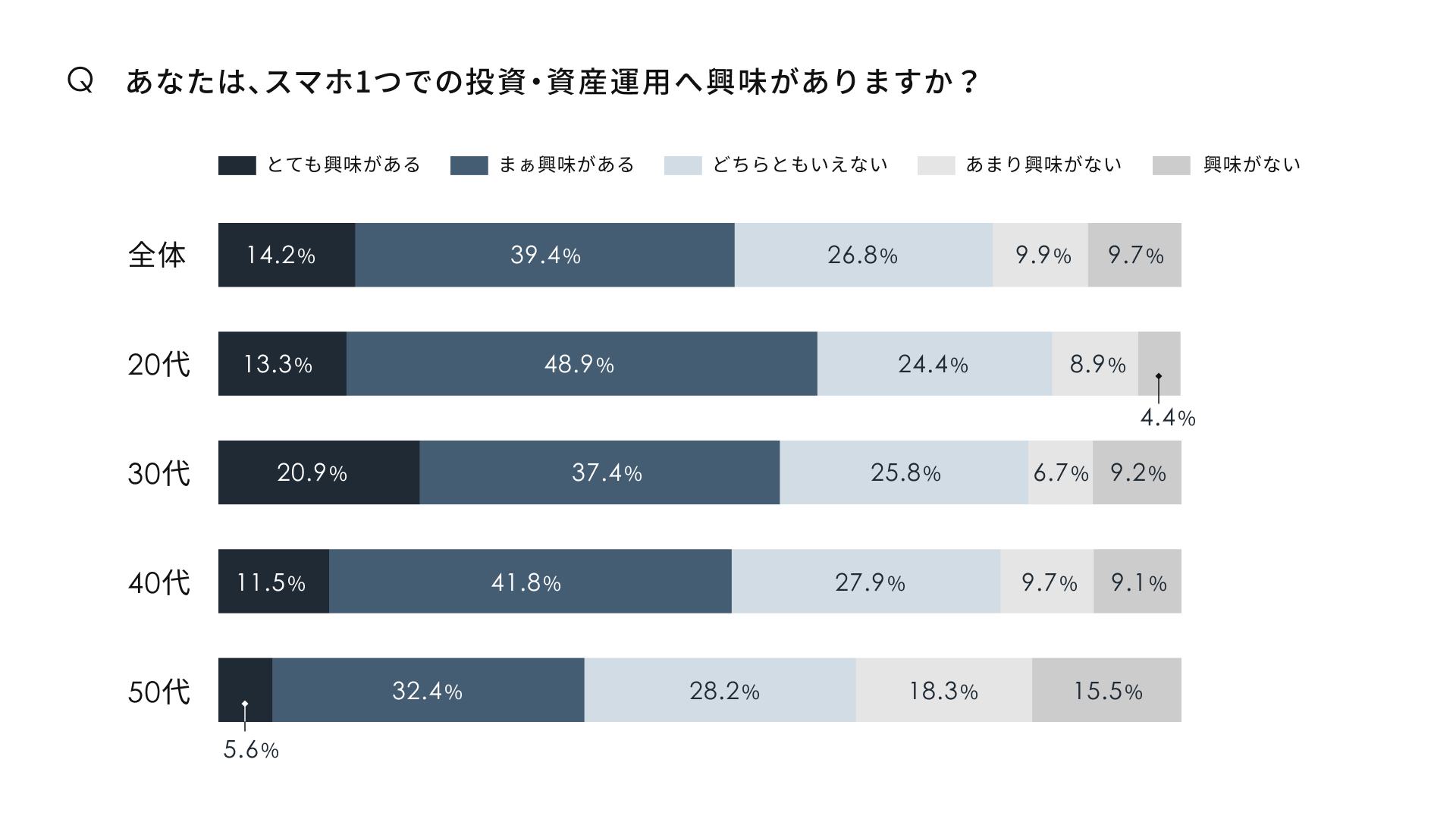 - 20〜40代の5割以上がスマホ1つでの投資・資産運用へ興味があると回答