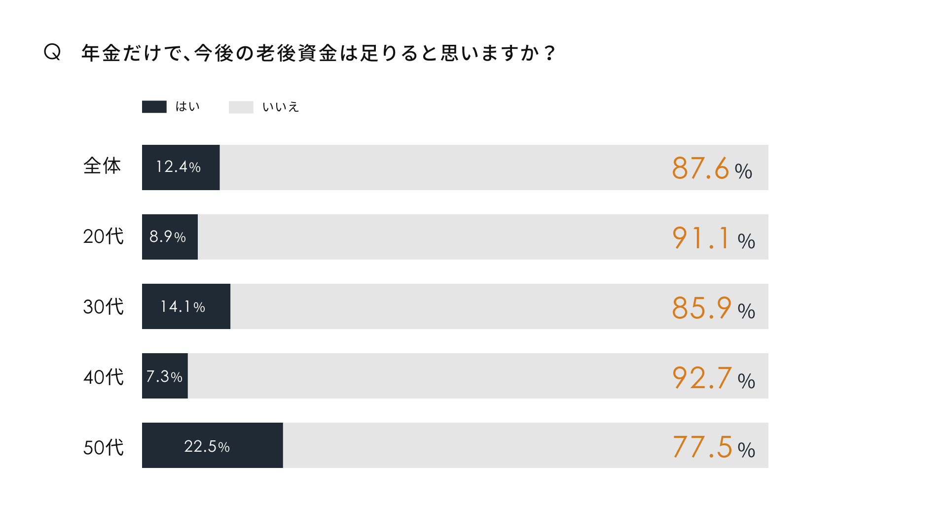 「年金だけで、今後の老後資金は足りると思いますか」との質問に対し、全体の87%が「いいえ」と回答。年代別では、20代で91%、30代で85%、40代で92%、50代で77%という結果に。老後2,000万円問題や寿命が長くなり定年退職以降の期間が長くなっている現在、87%の人が老後の資金に対して不安を感じていることが分かりました。
