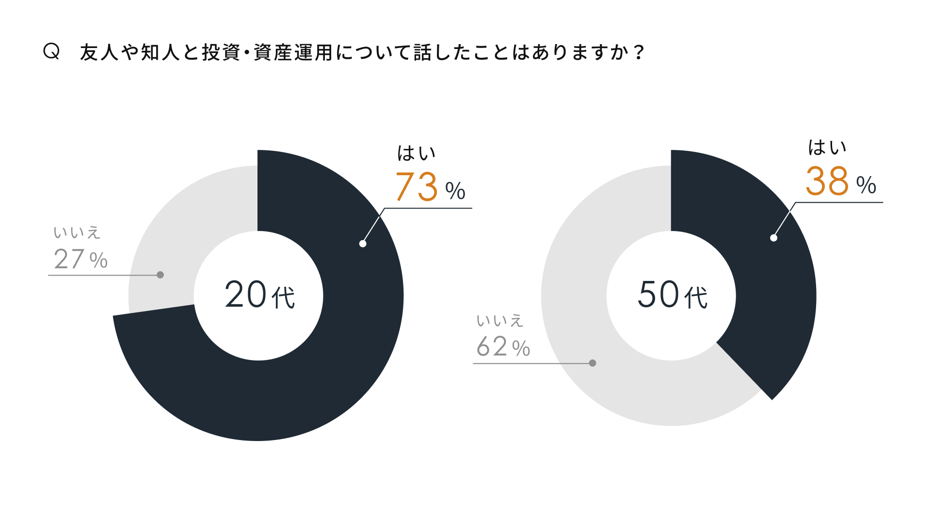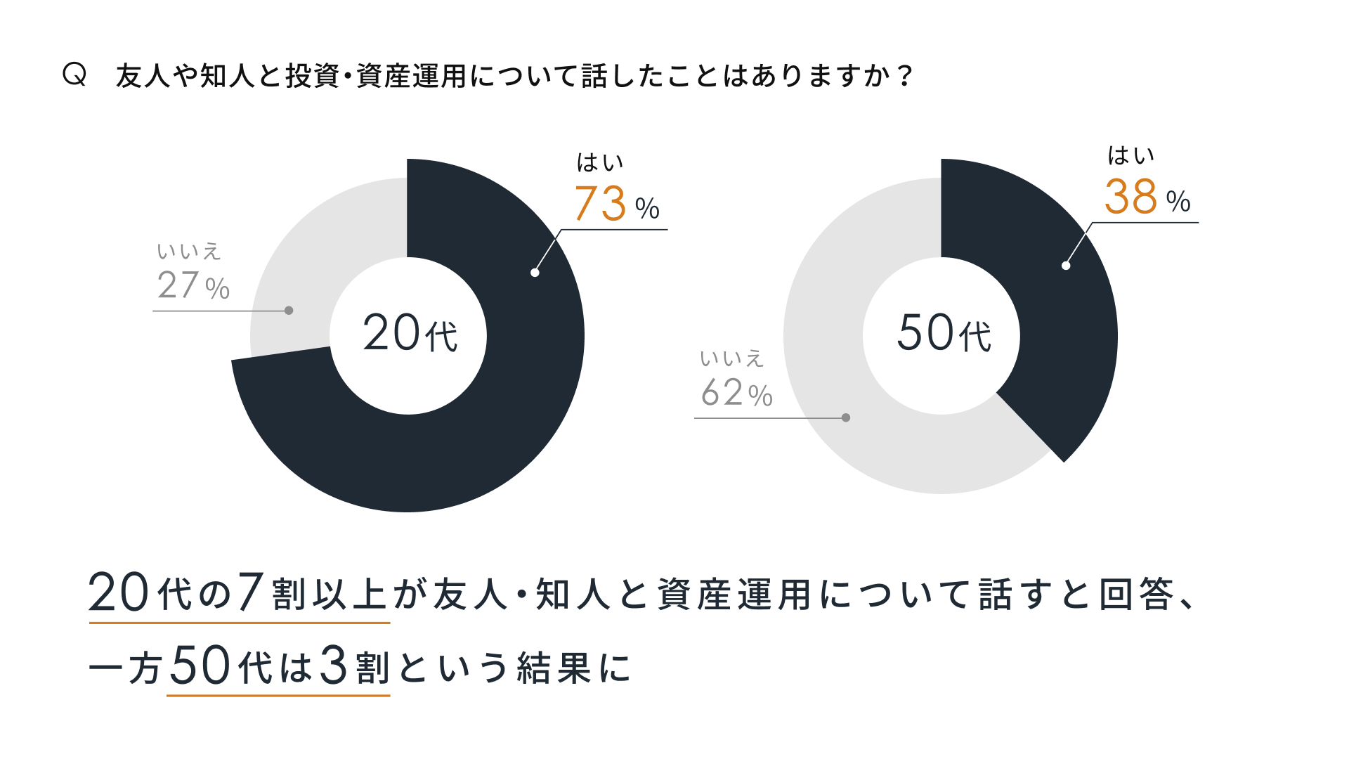 - 20代の7割以上が友人・知人と資産運用について話すと回答、一方、50代は3割という結果に
