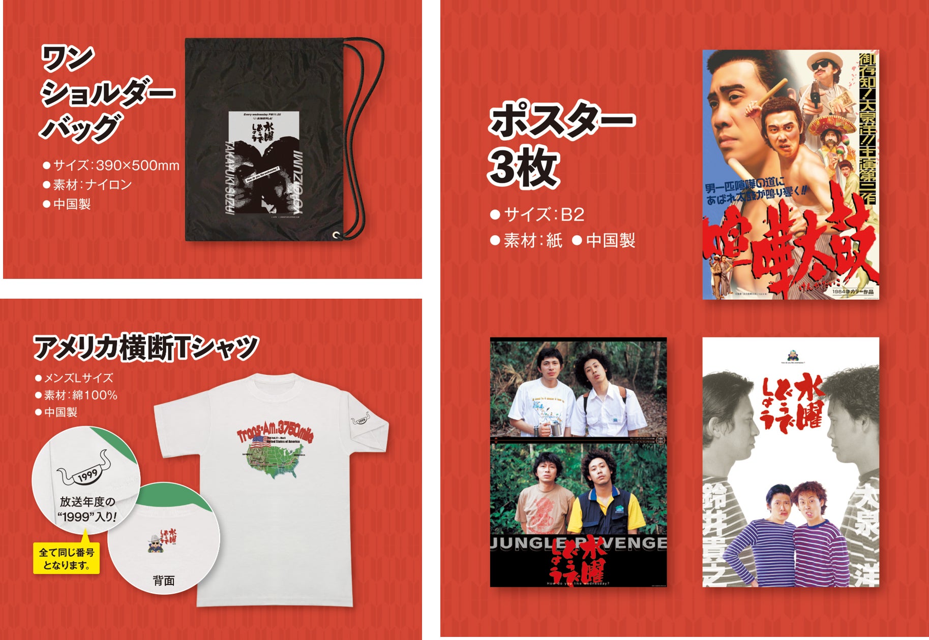 番組放送当初に発売されたワンショルダーバッグ・ポスター3枚・アメリカ横断Tシャツの3点を復刻して発売いたします。