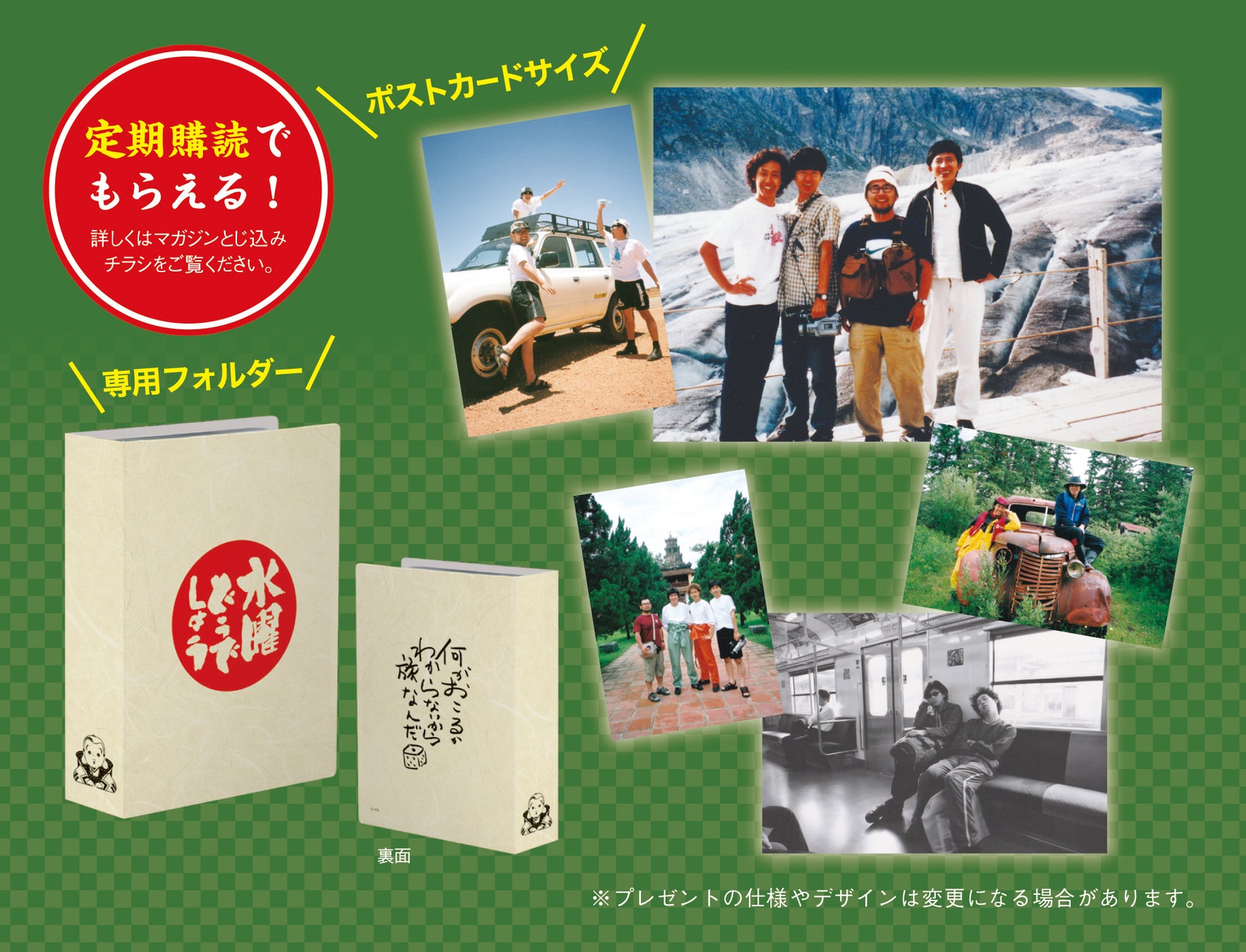 本シリーズでは豪華なオリジナルアイテムもご用意しています。ここでしか手に入らない未公開写真のオフショットカードや、「水曜どうでしょう」の番組内に登場するあの“サイコロフリップ”など、シリーズをより楽しめる特典も充実。