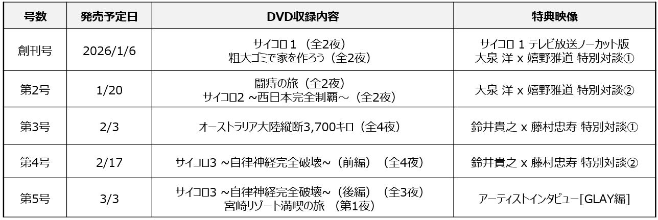 本シリーズでは、1996年にTV放送がスタートし、2026年に30周年を迎える伝説の番組を初めて放送順にDVDに収録。まるで初回放送時のように番組と出演陣の成長、そして30年分の旅の記録を追体験することができます。また、番組出演陣と制作陣の全面協力により、創刊記念インタビューも実現。マガジンでは書下ろしインタビューや番組にまつわる新情報など、ファンも楽しめる充実のコンテンツをお届けします。