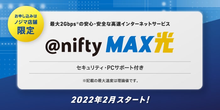 3月31日(木)までにノジマ店舗にて「@nifty MAX光」の予約申し込みをすると、工事費が無料になるほか(注2)、ニフティポイント3万ポイント、またはノジマポイント2万ポイントをプレゼントします。