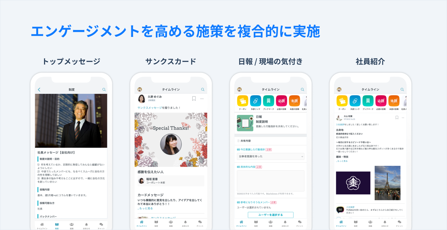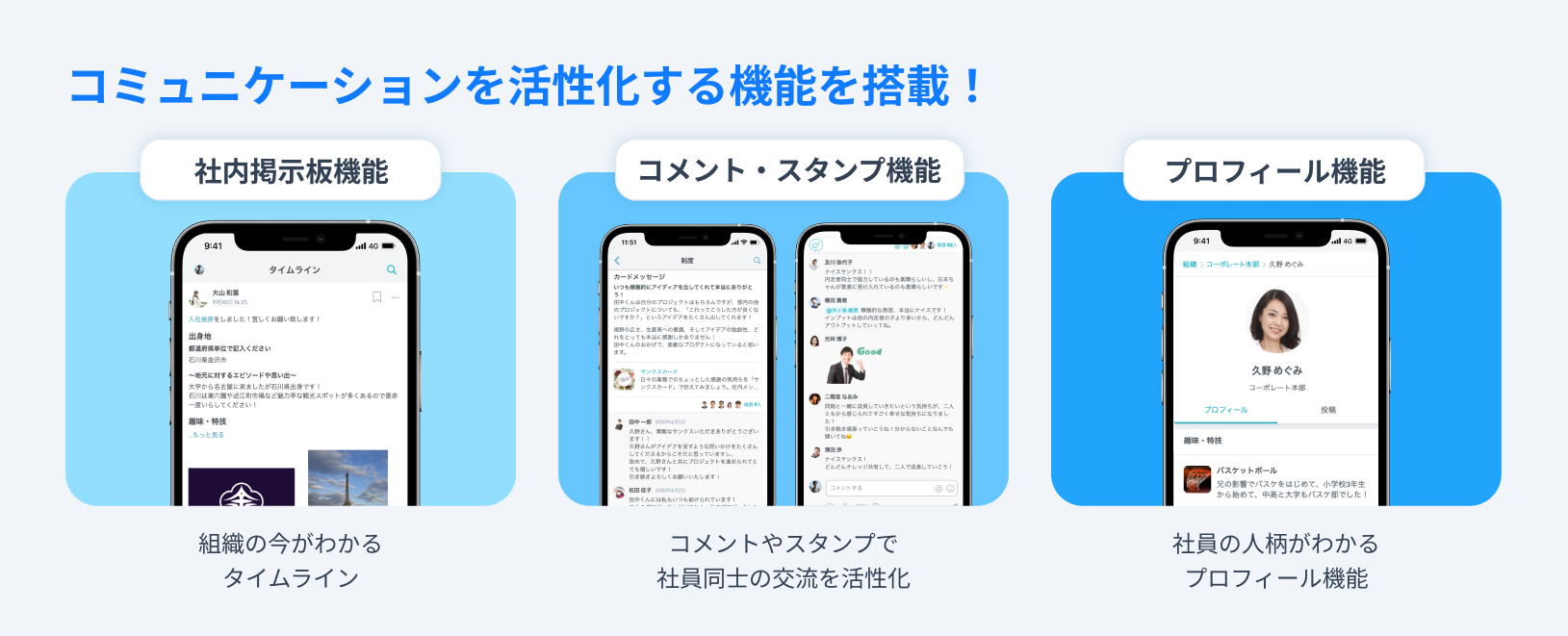 また、 社内掲示板 / コメント・スタンプ / プロフィールなどの社内コミュニケーションを促進する仕掛けが豊富に搭載されています。