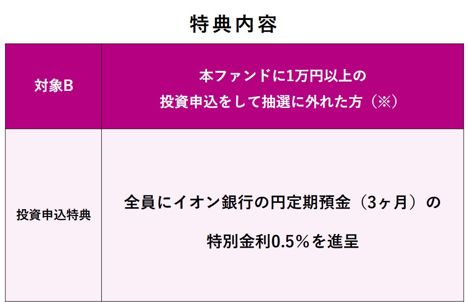 また、本ファンドの抽選募集で1万円以上の投資を申し込んだものの抽選募集に外れて投資実行に至らなかった方へも全員に、投資申込特典としてイオン銀行の円定期預金(3ヶ月)に特別金利で預入できる権利を進呈いたします。