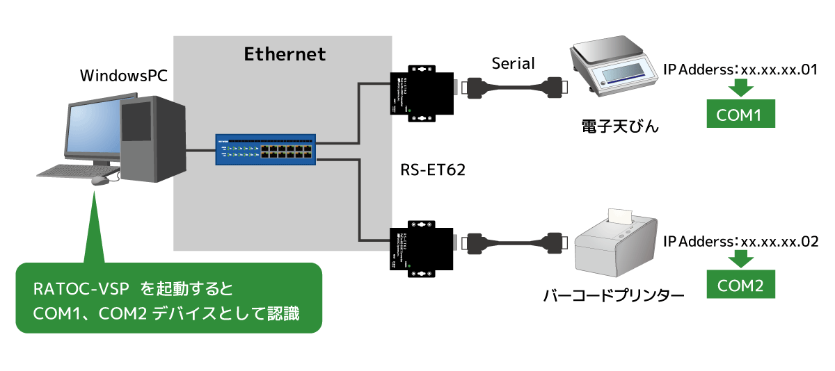 ダウンロード提供のCOMポートエミュレートドライバー「RATOC-VSP(Virtual Serial Port)」を使用することで、COMポートデバイス用アプリケーションがそのまま使用可能。ServerモードのRS-ET62に接続しているデバイスを、COMポートデバイスとして認識します。