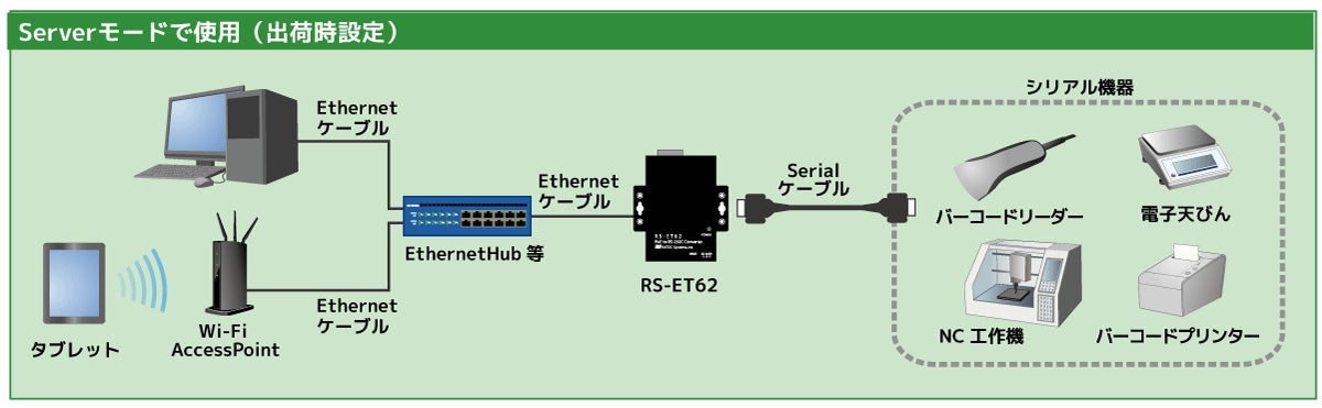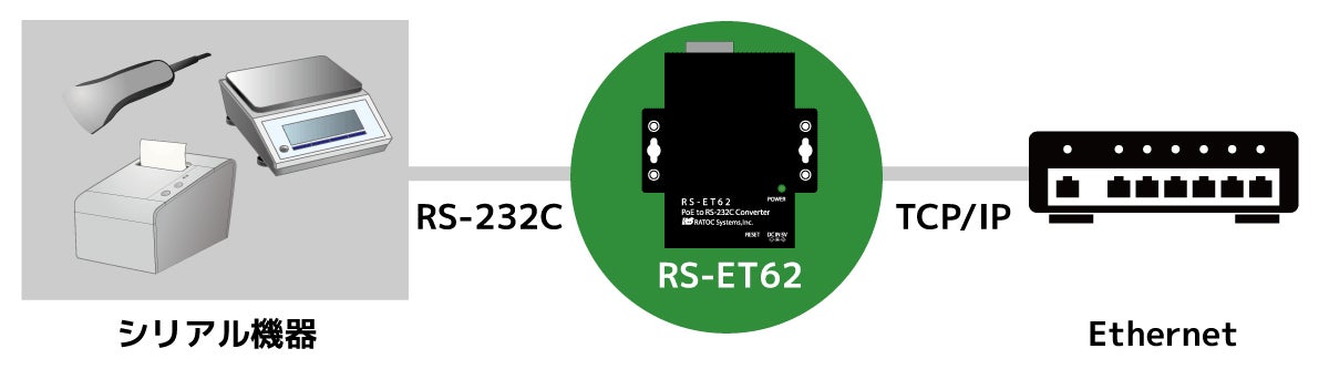 RS-ET62は、RS-232C信号をTCP/IPプロトコルに変換するコンバーターです。シリアルデバイスをEthernet経由で接続し、パソコンやPLCなどからIPデバイスとして制御します。