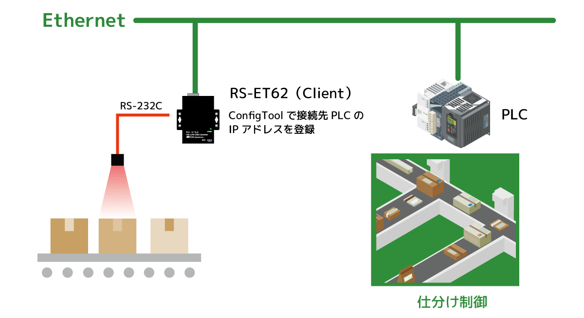 シリアルデバイスとEthernet機器(PLCなど)の通信をPCを介さずにおこないます。本製品をClientモードで使用します。