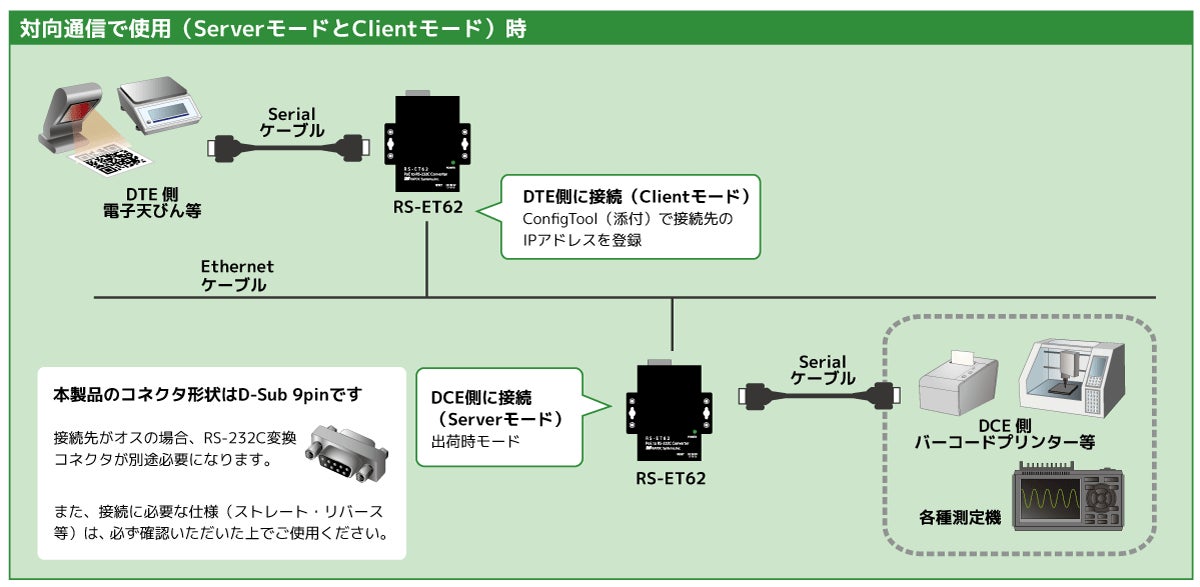 本製品をデバイス(DCE)側に接続するTCP Clientモード(以下Clientモード)と、ホスト(DTE)側に接続するTCP Serverモード(以下Serverモード)をサポート。ServerモードとClientモードを対向通信することにより、直接RS-232Cデバイス同士の通信が可能です。