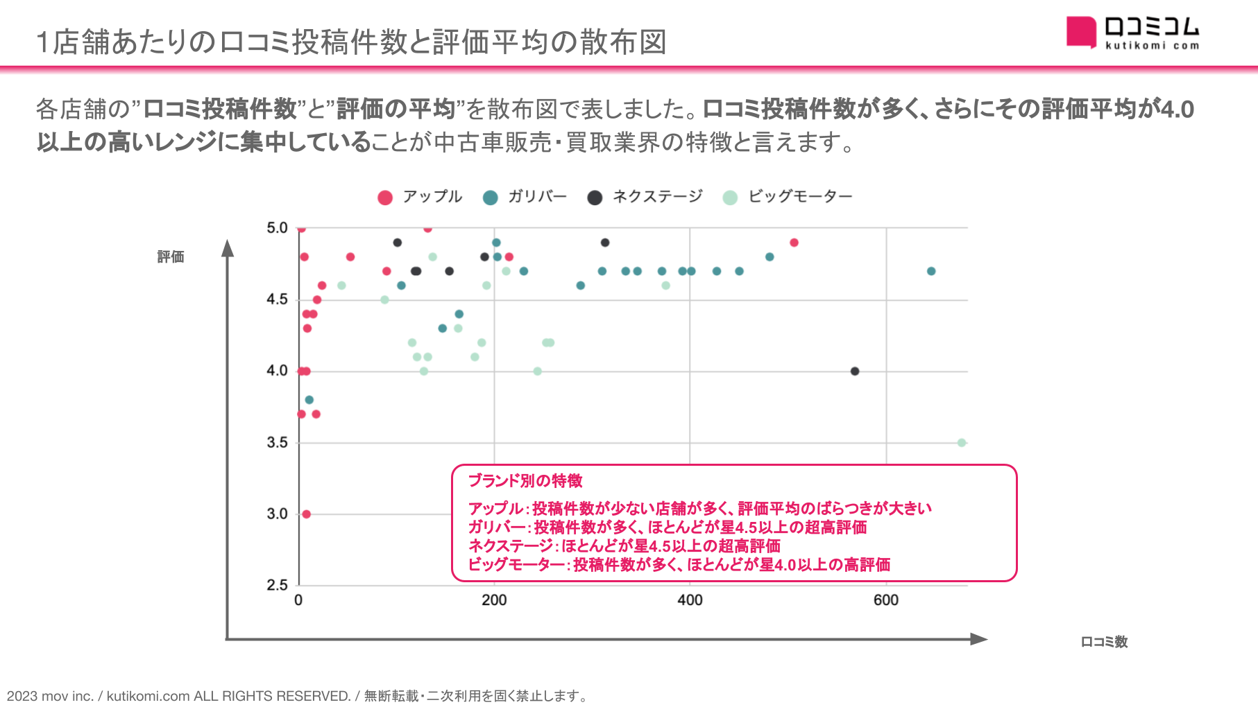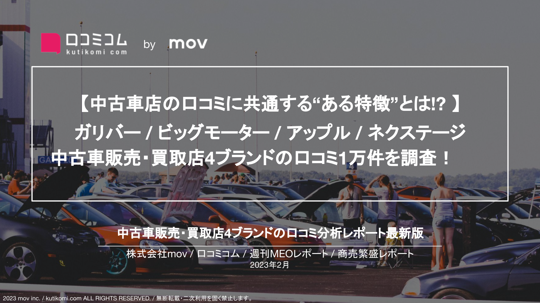 【ガリバー/ビッグモーター/アップル/ネクステージ】中古車店の口コミに共通する“ある特徴”とは!?中古車販売・買取店大手4ブランドの口コミ分析レポートを口コミコムが公開 #週刊MEOレポート