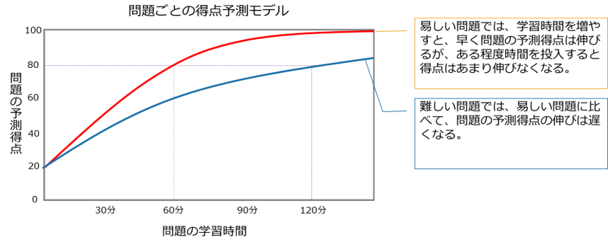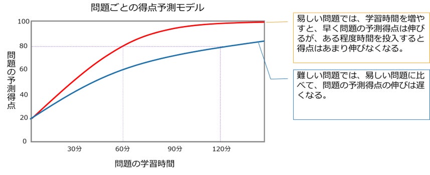 また、得点予測の際には、学習後に時間の経過につれて記憶が忘却する「忘却曲線効果」を含めて計算するなど、各種データとAIを活用して、複数の要因を基に予測を行っています。