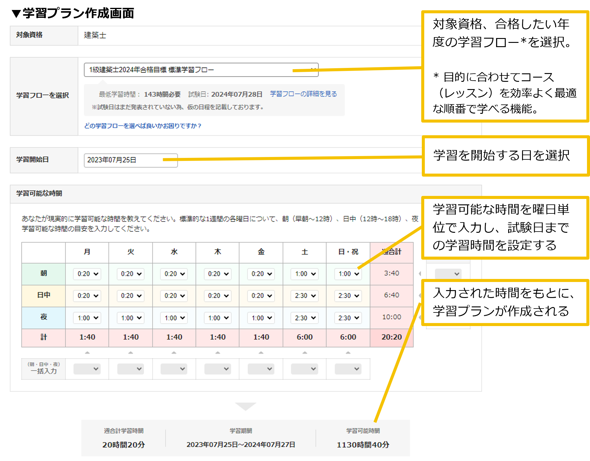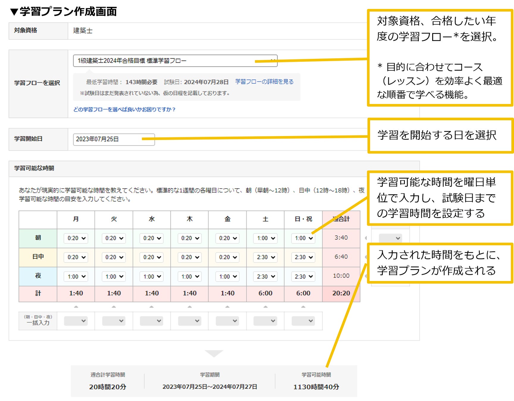 今回、スタディング1級建築士講座で「AI学習プラン」を導入することにより、受講者一人ひとりに合った効率的な学習計画を利用いただけるようになります。AI学習プランは、学習をスタートする日と受講者が確保できる学習時間を入力することで、AIが、過去の受講者による膨大な学習履歴データを分析して、最も得点が伸ばしやすい試験日までのスケジュールを個別に作成します。講座受講者は、AI学習プランを見れば「今日、何をどこまでやればいいのか」がわかるので、学習の進め方に悩まず、貴重な学習時間を最大限に活用して、効率的に試験合格を目指せます。